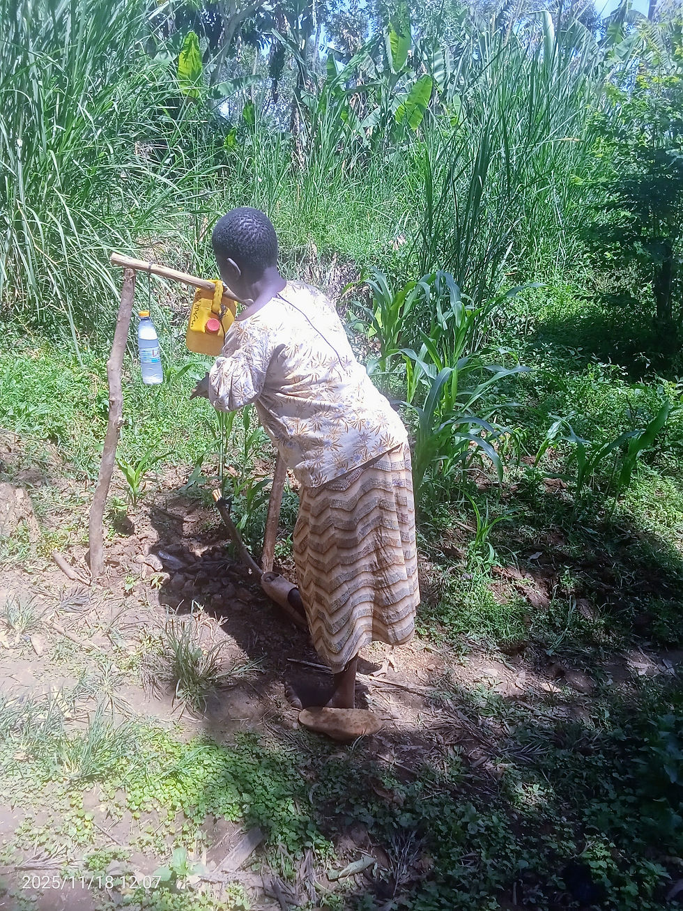 UKR's Public Health team helps families build simple, hygienic hand washing stations that use a foot pedal to tilt a jug. This simple Covid-era innovation is much better than holding a jug in one hand (and possibly contaminating it) while washing the other hand. Locally made liquid soap is then hung in an old water bottle, with a pinhole in the top for pouring.